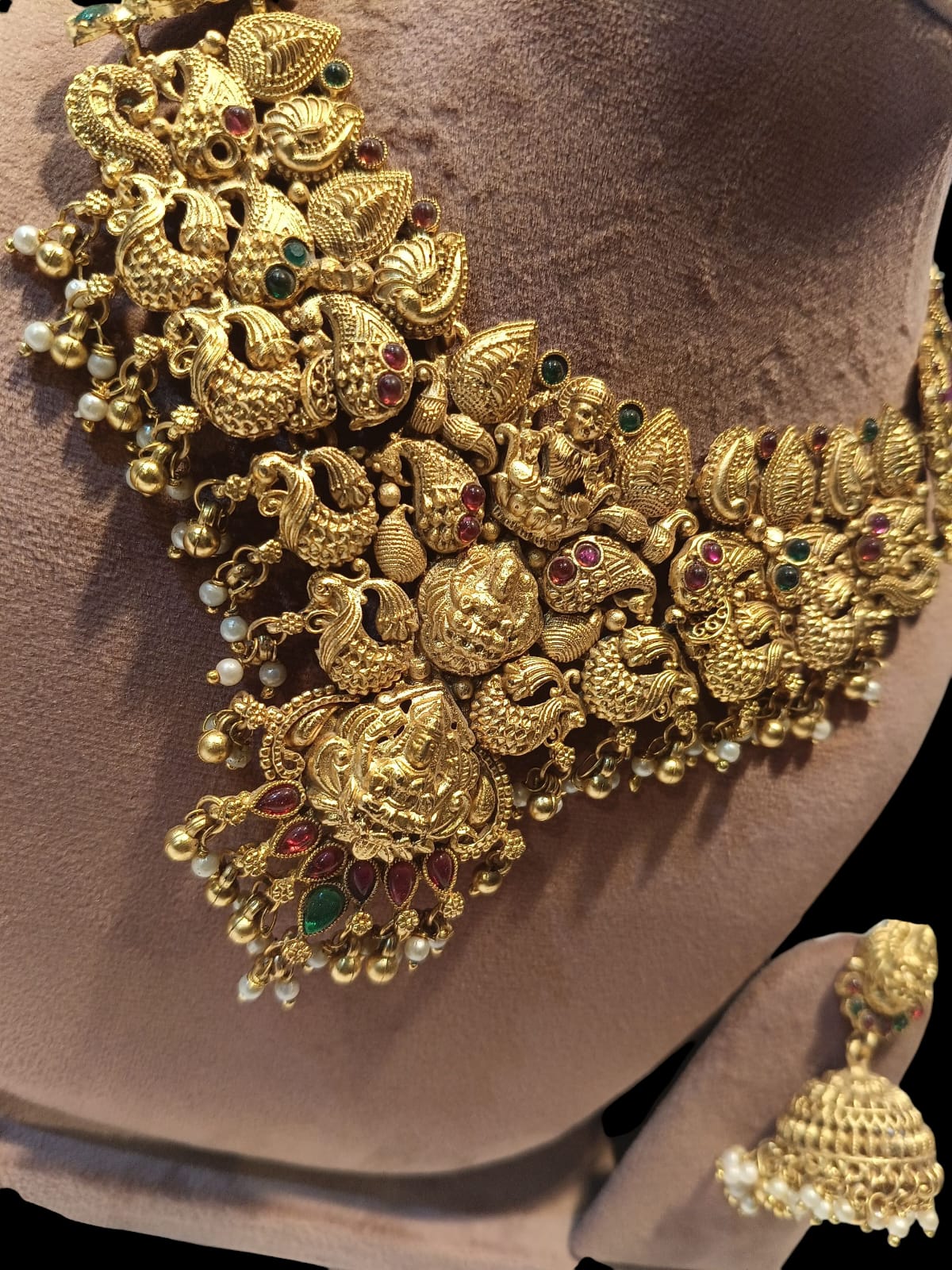 Elevate your ethnic elegance with our Royal Lakshmi Temple Necklace Set, intricately crafted in antique gold finish. This premium set features a bold choker-style necklace adorned with Goddess Lakshmi motifs, peacock designs, and vibrant ruby, emerald, and pearl embellishments. Delicate hanging beads add graceful movement, making it a perfect choice for weddings, festivals, and traditional occasions. Comes with matching heavy Jhumka-style earrings to complete your regal look.